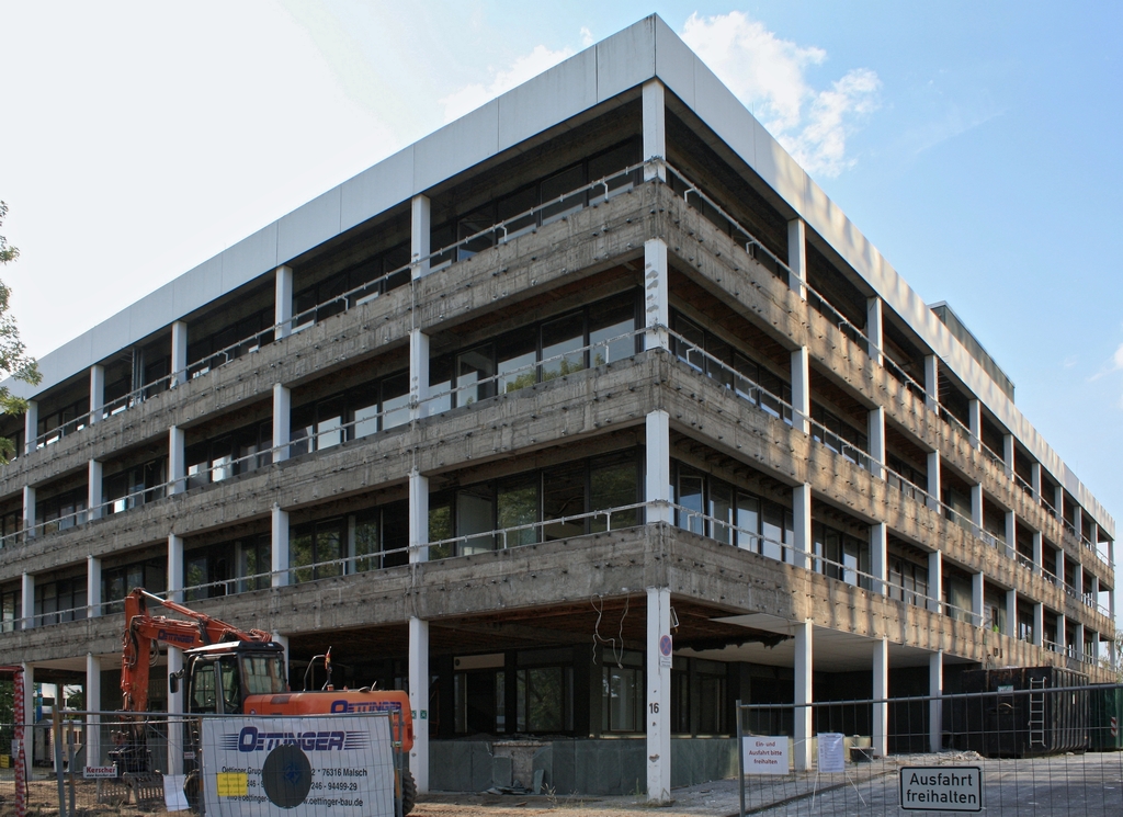 Auch ein Bauschild findet sich, bisher nur für den Abbruch. Erteilt wurde die Abbruchgenehmigung demnach erst im vergangenen Juli. Wie sge1899ev richtig vermutete, wird das Bestandsgebäude und die Tiefgarage vollständig abgerissen, bis Oberkante Bodenplatte. Die Abbrucharbeiten erledigt die Oettinger GmbH aus dem badischen Malsch.