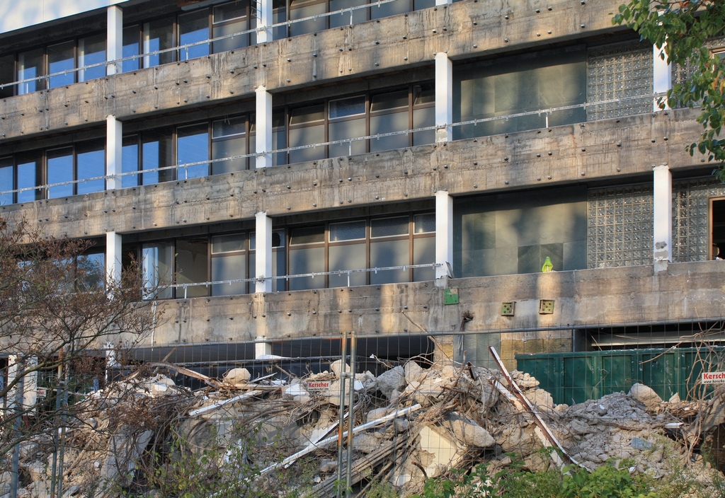 Das zehngeschossige Hochhaus Hahnstraße 46 wird doch abgerissen und nicht, wie zunächst beabsichtigt, zu einem Wohngebäude umgebaut. Fotos gibt es hier und zusammen mit dem alten Rechenzentrum, dessen Abbruch schon länger feststeht, auch dort.