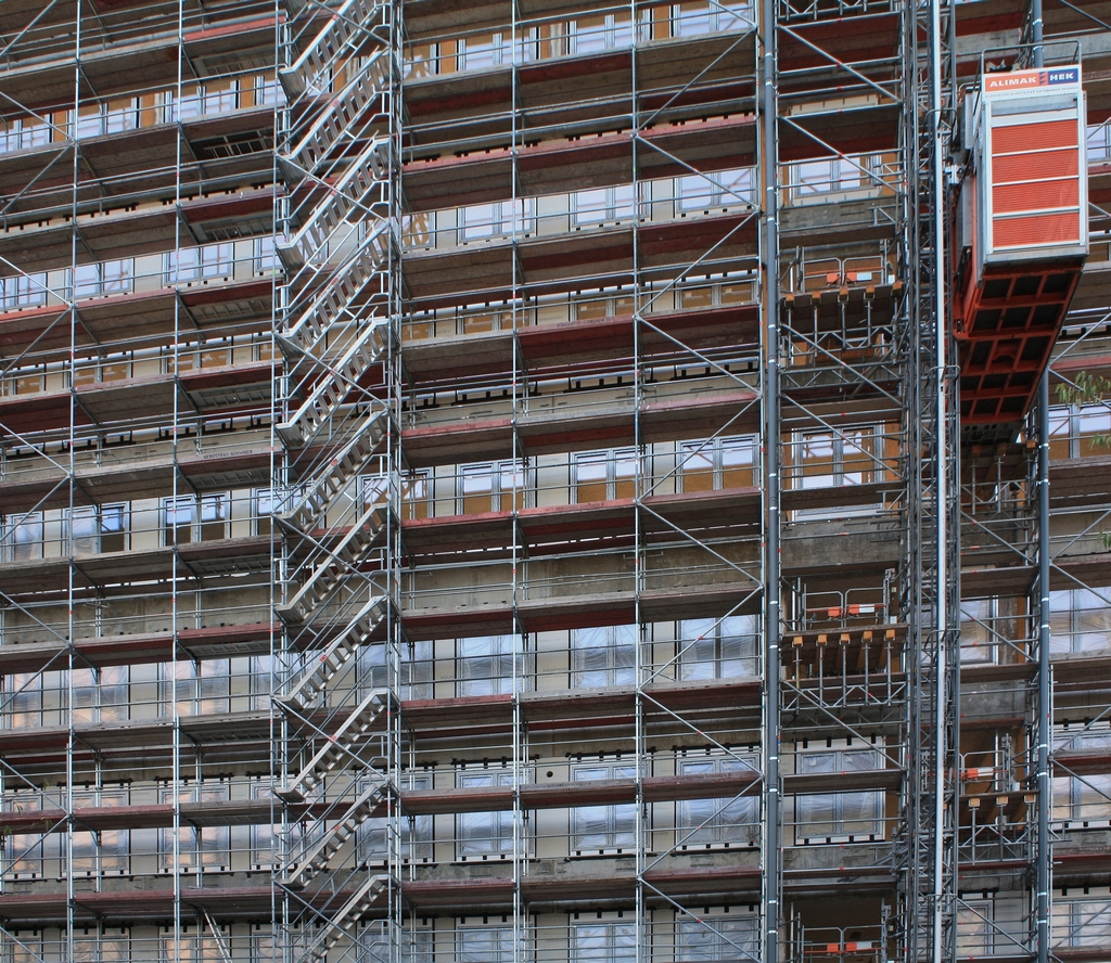 An der Ostseite sind bereits Fenster eingesetzt. Dazwischen wurden zementgebundene Bauplatten eingefügt (Aufschrift "Aquapanel", ein Marke von Knauf). Die Brüstungen sind, wenn ich das richtig sehe, noch Bestand. Diese Vorgehensweise dürfte den vergleichsweise schnellen Baufortschritt erklären.