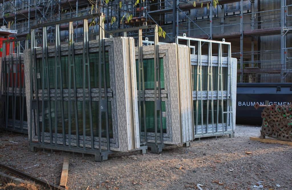 Die Fenster vor dem Einbau. Sie sind noch mit Folie umgeben, die Aufschrift darauf lautet Schüco.