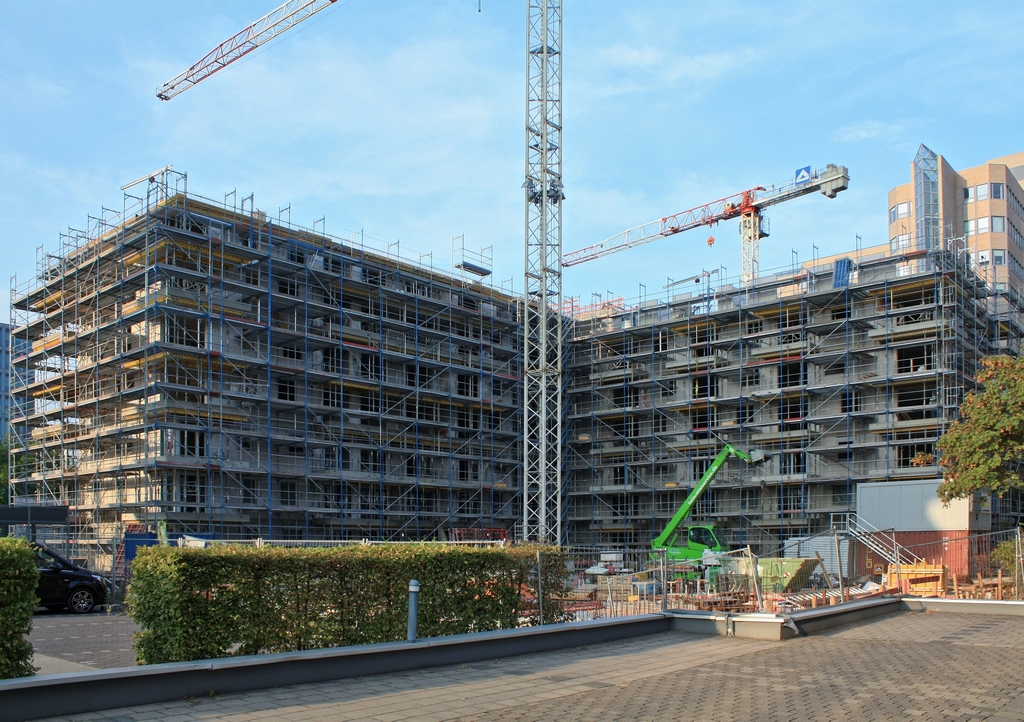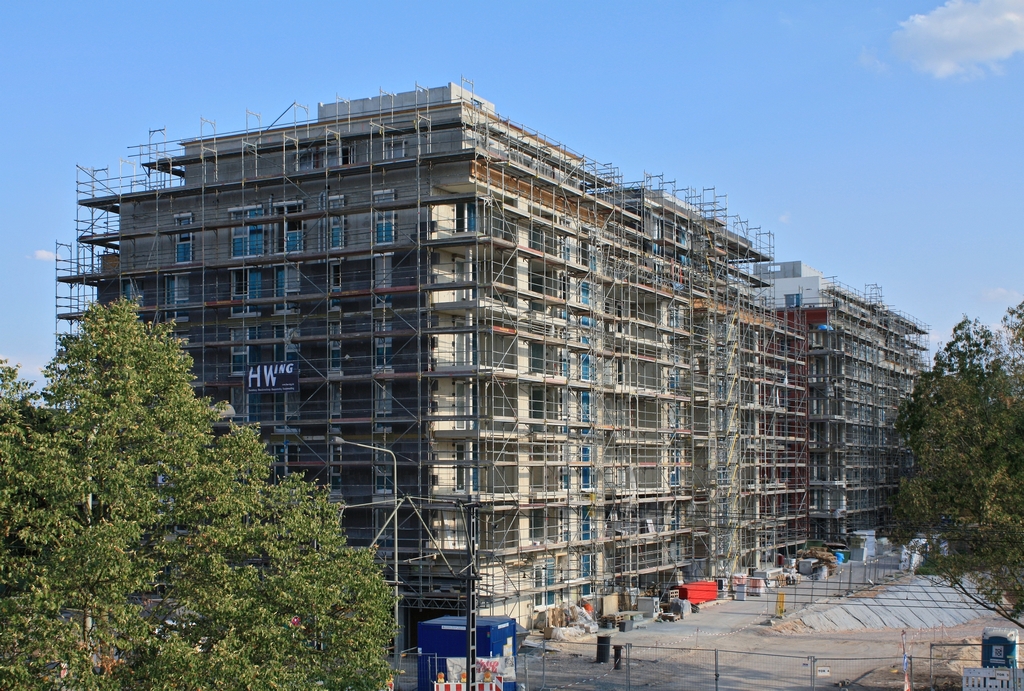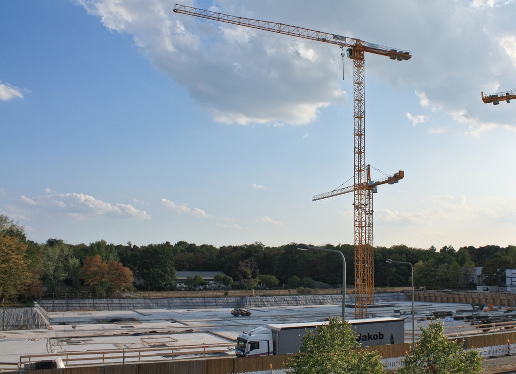 An der Rhonestraße 2, dem früheren Grundstück der Postgewerkschaft, nähert sich der Rohbau für das Wohnungsbauvorhaben "Living Lyon" der Fertigstellung. Hochtief baut. Hier die Hofseite: