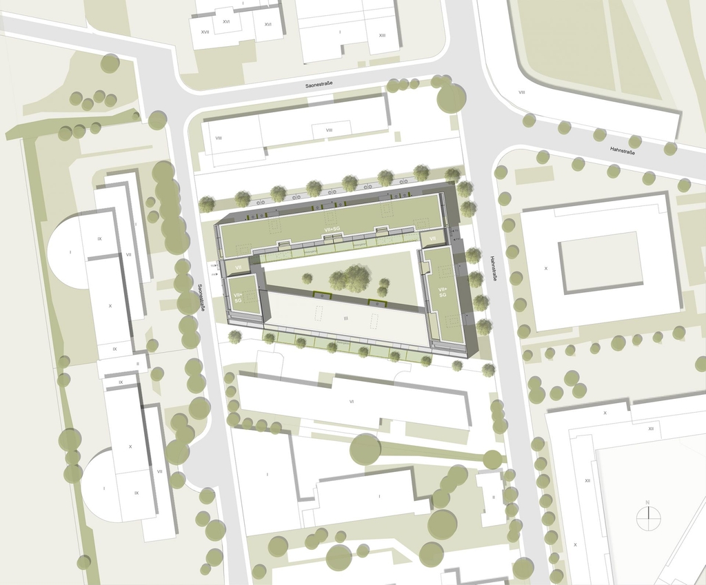 Die Nassauische Heimstätte entschied sich nach "weiterführenden Untersuchungen" schließlich gegen den Erhalt des Hochhauses und für die Errichtung von Neubauten auf dem gesamten Grundstück. Der Entwurf sieht eine U-förmige Bebauung mit sieben Geschossen plus Staffelgeschoss vor. Geschlossen wird das "U" durch einen Gebäuderiegel im Süden mit nur drei Geschossen. Rund 200 Wohnungen sollen entstehen. Ansicht von der Saonestraße und Plan: