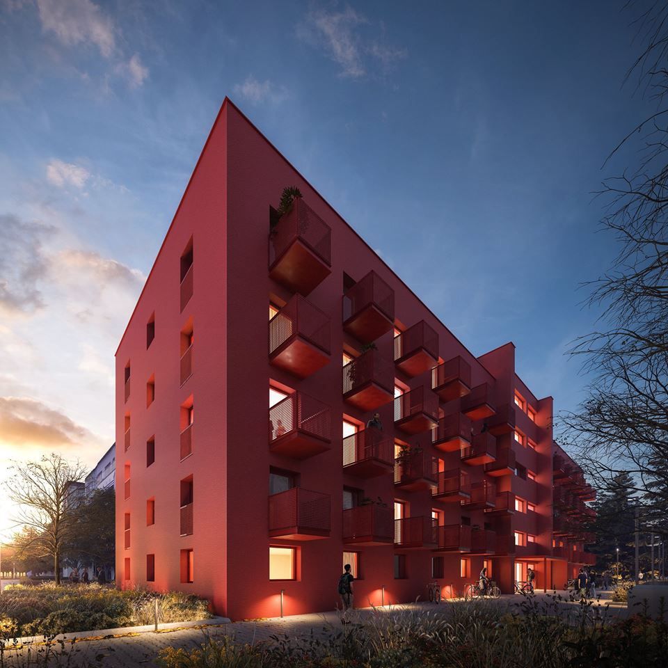 Cube Real Estate erhielt Ende September die Genehmigung für den Umbau des Arbeiterwohnheims Goldsteinstraße 130 (Foto in #271) in ein Apartmenthaus. Die Bauarbeiten sollen Anfang des Jahres 2019 beginnen, der Erstbezug der 3.100 m² Wohnfläche ist Ende 2020 geplant (Q). Rot soll die Fassade des Gebäudes werden, mit Details aus Chrom. Die folgende Visualisierung ist noch nicht final, der Leverkusener Entwickler behält sich Änderungen vor.