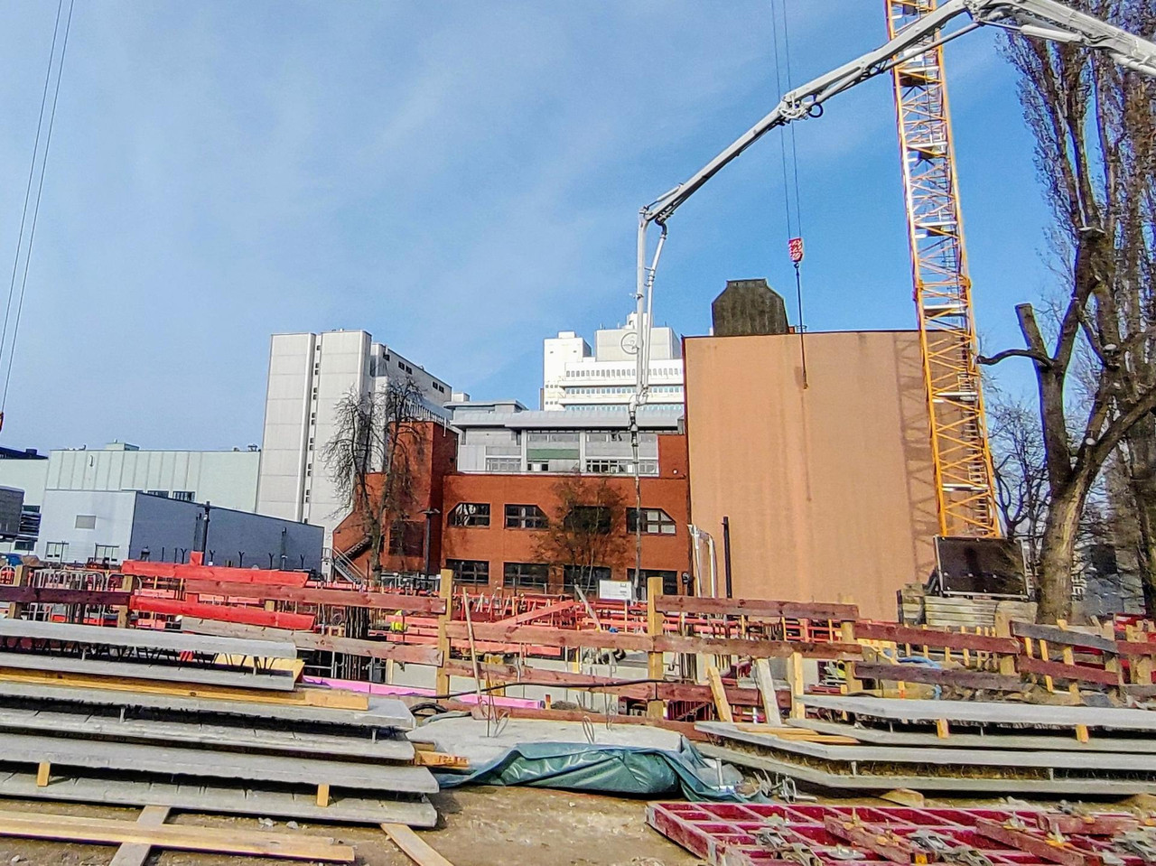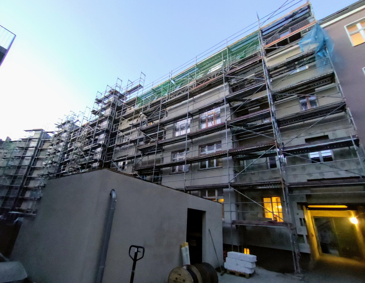 Nicht mehr lange, können die ersten Mieter in das neue Gebäude Einziehen. Bein Altbau, werden die Fassaden neu ersetzt & weiterhin am Dachgeschoss gearbeitet.