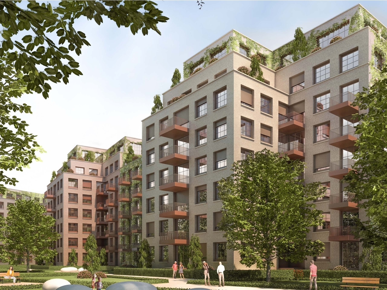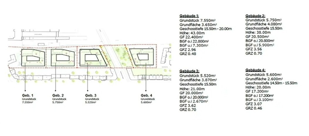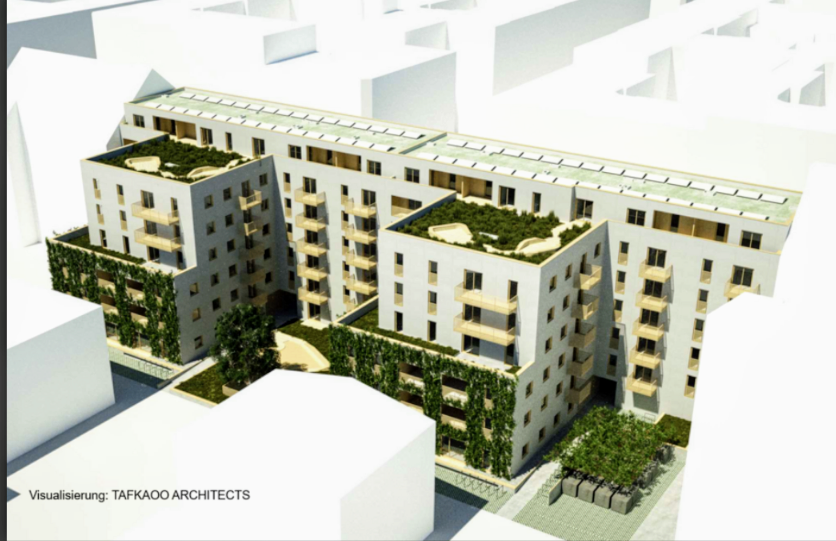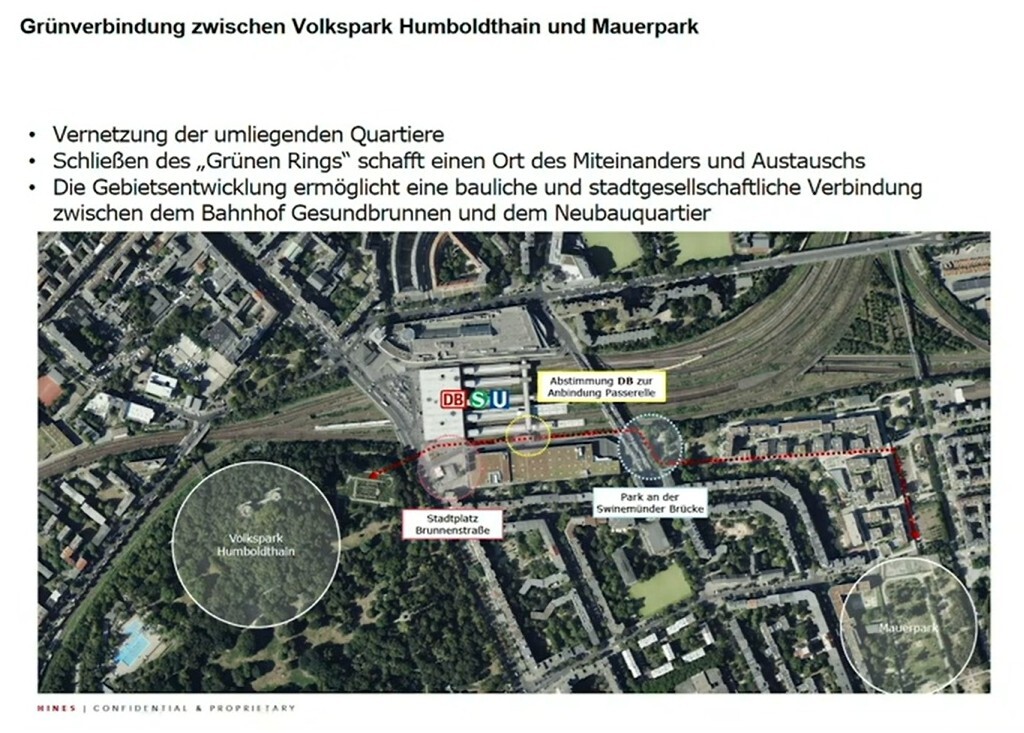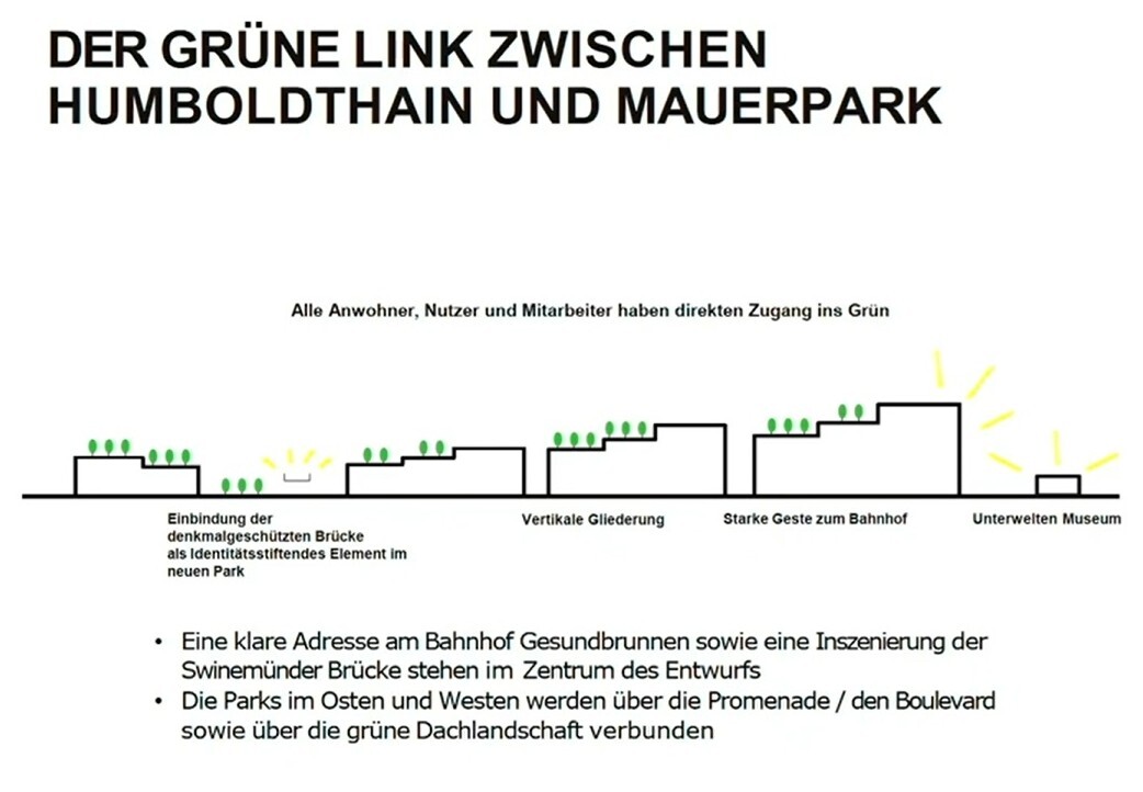 Neben den 4 Gebäuden soll eine Grünverbindung zwischen dem Volkspark Humboldthain und dem Mauerpark entstehen.